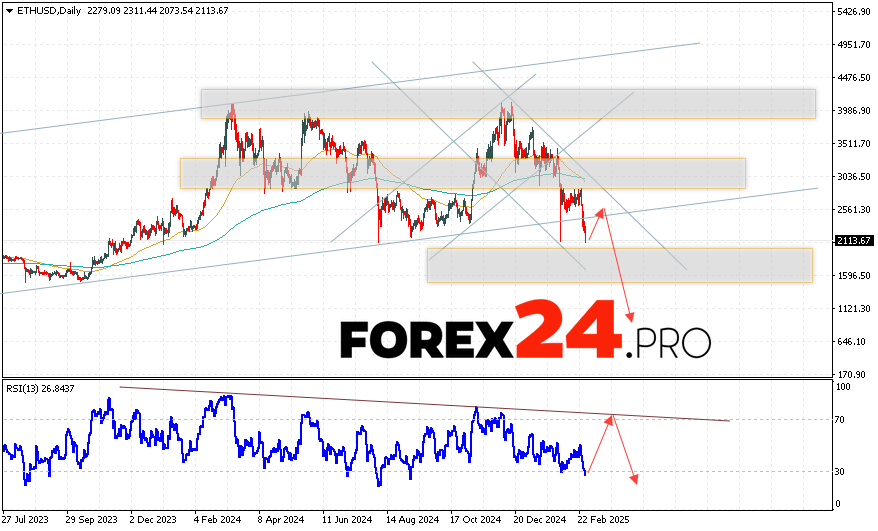 Ethereum Weekly Forecast March 3 — 7, 2025 suggests an attempt to develop a bullish correction and test the resistance area near the 2545 level. From where we should expect a downward rebound and continued fall of the cryptocurrency to the area below the 1045 level. An additional signal in favor of a decline in the Ethereum rate will be a test of the trend line on the relative strength indicator. The cancellation of the fall option will be a strong growth and a breakout of the 2765 area. In this case, we should expect continued growth with a target above the 3035 area.