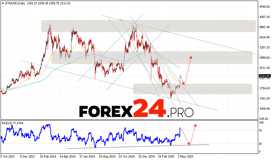 Ethereum Weekly Forecast May 12 — 16, 2025 suggests an attempt to develop a bearish correction and test the support area near the level of 1785. From where we should expect an upward rebound and continued growth of the cryptocurrency to the area above the level of 2885. An additional signal in favor of the rise in the Ethereum rate will be a test of the trend line on the relative strength indicator. The cancellation of the growth option will be a fall and a breakout of the 1565 area. In this case, we should expect a continuation of the decline with a target below the 1145 area.