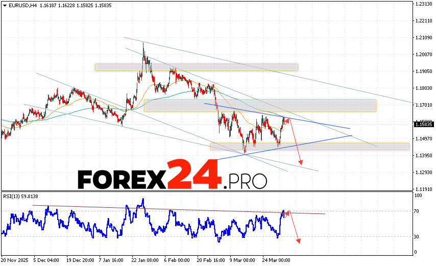EUR/USD Forecast Euro Dollar for April 2, 2026 suggests an attempt to develop a bullish correction in currency quotes with a test of the resistance level near 1.1595. Where should we expect a downward rebound in the Euro/Dollar currency pair and an attempt to continue the instrument’s decline on the Forex market, targeting 1.1325? An additional signal supporting this scenario would be a rebound from the resistance line on the relative strength indicator (RSI). A strong rise in the EUR/USD pair and a breakout of 1.1655 would cancel the downward scenario. This would indicate a breakout of the resistance zone and a continued rise in the currency pair on Forex to 1.1875.