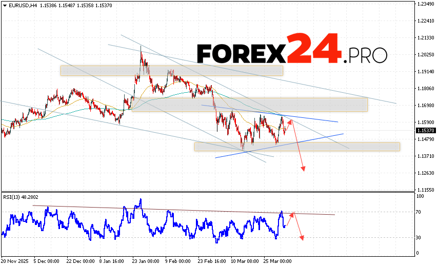 EUR/USD Forecast Euro Dollar for April 3, 2026 suggests an attempt at a bullish correction in currency quotes with a test of the resistance level near 1.1590. Where should we expect a downward rebound in the Euro/Dollar currency pair and an attempt to continue the instrument’s decline on the Forex market, targeting 1.1275? An additional signal supporting this scenario would be a rebound from the resistance line on the relative strength indicator (RSI). A strong rise in the EUR/USD pair and a breakout of 1.1675 would cancel the downward scenario. This would indicate a breakout of the resistance zone and a continued rise in the currency pair on Forex to 1.1885.