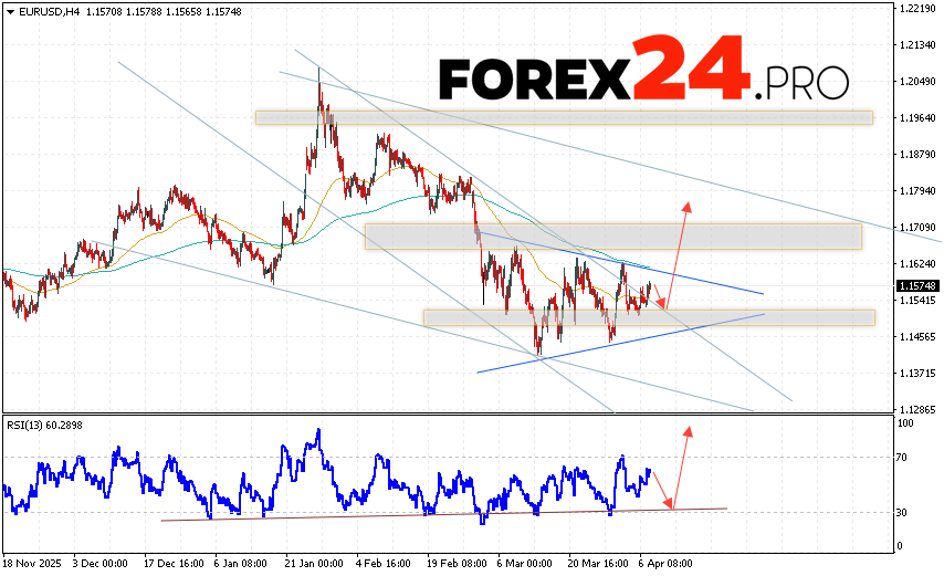 EUR/USD Forecast Euro Dollar for April , 2026 suggests an attempt to develop a bullish correction in currency quotes with a test of the resistance level near 1.1535. Where should we expect an upward rebound in the Euro/Dollar currency pair and an attempt to continue the instrument’s growth on the Forex market, targeting 1.1745? An additional signal supporting this scenario would be a rebound from the support line on the relative strength indicator (RSI). A decline in the EUR/USD pair and a breakout of 1.1445 would cancel the upward trend. This would indicate a breakout of the support zone and a continued decline in the currency pair on Forex toward 1.1265.