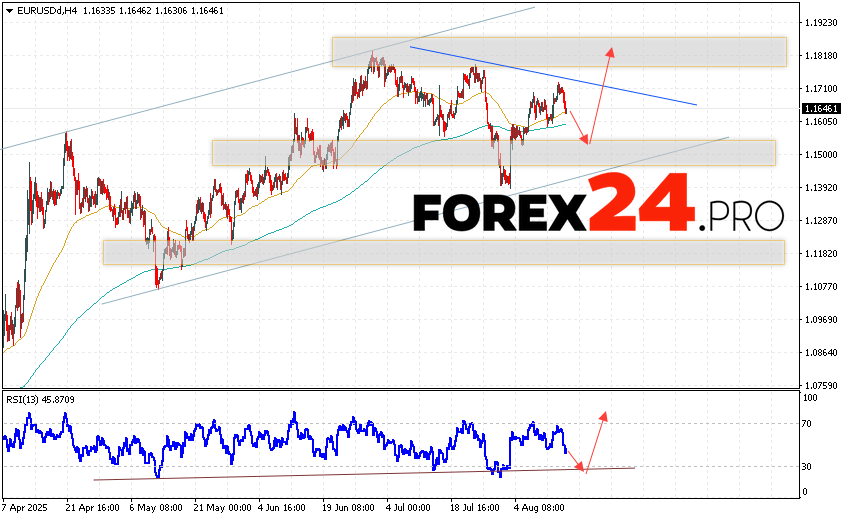 EUR/USD Forecast Euro Dollar for August 15, 2025 suggests an attempt to develop a bullish correction in currency quotes with a test of the support level near 1.1535. This should lead to an upward rebound in the Euro Dollar currency pair and an attempt to continue the growth of the asset’s value on the market to 1.1825. A rebound from the support line on the relative strength index (RSI) will serve as an additional signal in favor of the instrument’s rise on the Forex market. A decline in quotes and a breakout of the 1.1375 level will cancel the EUR/USD growth scenario. This will indicate a breakout of the support zone and a continuation of the currency pair’s decline on Forex to the 1.1185 mark.