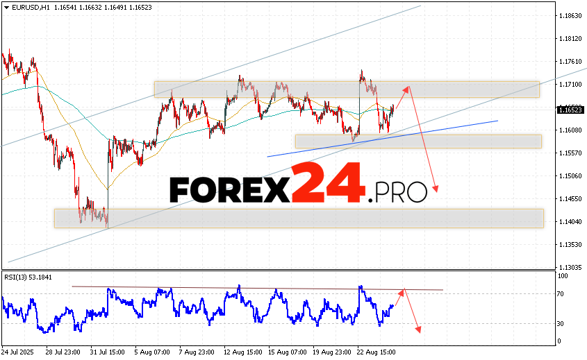 EUR/USD Forecast Euro Dollar for August 27, 2025 suggests an attempt to develop a bullish correction of currency quotes with a test of the resistance level near the level of 1.1705. Where should we expect a rebound in quotes downwards for the Euro Dollar currency pair and an attempt to continue the fall in the value of the asset on the market to 1.1475. An additional signal in favor of a decrease in the instrument on the Forex market will be a rebound from the resistance line on the relative strength indicator (RSI). The cancellation of the option of falling EUR/USD will be a strong increase in quotes and a breakout of the level of 1.1785. This will indicate a breakout of the resistance zone and continued growth of the currency pair on Forex to 1.2035.