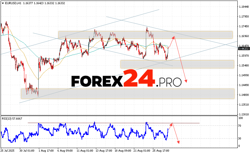 EUR/USD Forecast Euro Dollar for August 28, 2025 suggests an attempt to develop a bullish correction of currency quotes with a test of the resistance level near the level of 1.1675. Where should we expect a downward rebound in quotes for the Euro Dollar currency pair and an attempt to continue the fall in the asset value on the market to the level of 1.1465. An additional signal in favor of a decline in the instrument on the Forex market will be a rebound from the resistance line on the relative strength indicator (RSI). The cancellation of the fall option for the EUR/USD pair will be a strong increase in quotes and a breakout of the level of 1.1765. This will indicate a breakout of the resistance zone and continued growth of the currency pair on Forex to 1.1985.