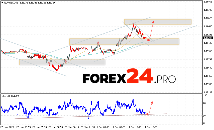EUR/USD Forecast Euro Dollar for December 2, 2025 suggests an attempt at a bearish correction in currency quotes, testing support near 1.1615. This is where we should expect an upward rebound in the EUR/USD pair and an attempt at continued growth to 1.1675. A rebound from the support line on the relative strength indicator (RSI) will serve as a supporting signal for an upside move in the Forex market. A decline in quotes and a breakout of 1.1605 will cancel out the EUR/USD upside. This will indicate a breakout of the support zone and a continued decline in the Forex currency pair toward 1.1435.