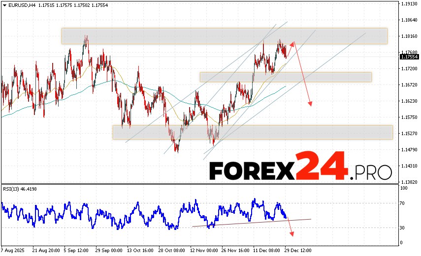 EUR/USD Forecast Euro Dollar for December 30, 2025 suggests an attempt at a bullish correction in currency quotes, testing resistance near 1.1785. This is where we should expect a downward rebound in the EUR/USD pair and an attempt at continued decline in the Forex market, targeting 1.1615. A breakout from the resistance line on the relative strength indicator (RSI) will serve as an additional signal. A strong rally and a breakout of 1.1875 would cancel the EUR/USD downside scenario. This would indicate a breakout of the resistance zone and continued growth in the Forex currency pair toward 1.1995.