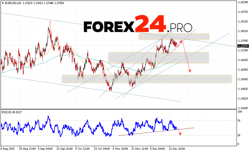EUR/USD Forecast Euro Dollar for December 31, 2025 suggests an attempt at a bullish correction in currency quotes, testing resistance near 1.1780. This is where we should expect a downward rebound in the EUR/USD pair and an attempt at continued decline in the Forex market, targeting 1.1605. A breakout from the resistance line on the relative strength indicator (RSI) will serve as an additional signal. A strong rally and a breakout of 1.1875 would cancel the EUR/USD downside scenario. This would indicate a breakout of the resistance zone and continued growth in the Forex currency pair toward 1.1995.