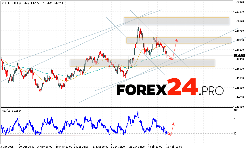 EUR/USD Forecast Euro Dollar for February 20, 2026 suggests an attempt at a bearish correction in currency quotes, testing support near 1.1765. This is where we should expect an upward rebound in the EUR/USD pair and an attempt at continued growth in the Forex market, targeting 1.1915. A breakout from the support line on the relative strength indicator (RSI) will serve as an additional signal. A decline in quotes and a break of 1.1705 will cancel the upward trend for the EUR/USD pair. This will indicate a break of the support zone and a continued decline in the currency pair on Forex toward 1.1465.