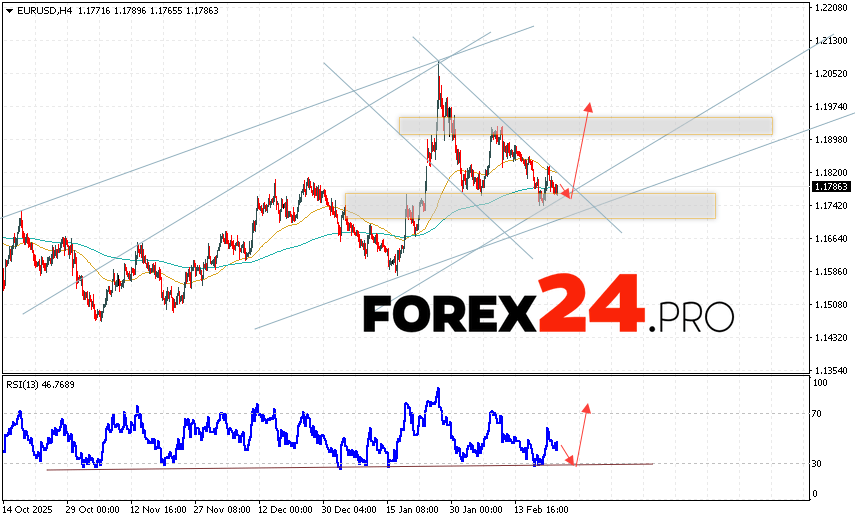 EUR/USD Forecast Euro Dollar for February 25, 2026 suggests an attempt at a bearish correction in currency quotes with a test of support near 1.1765. This is where we should expect an upward rebound in the EUR/USD pair and an attempt at continued growth in the Forex market with a target of 1.1975. A rebound from the support line on the relative strength indicator (RSI) would serve as an additional signal. A decline in quotes and a breakout of 1.1695 would cancel out the EUR/USD upside. This will indicate a breakout of the support zone and a continued decline in the Forex currency pair toward 1.1575.