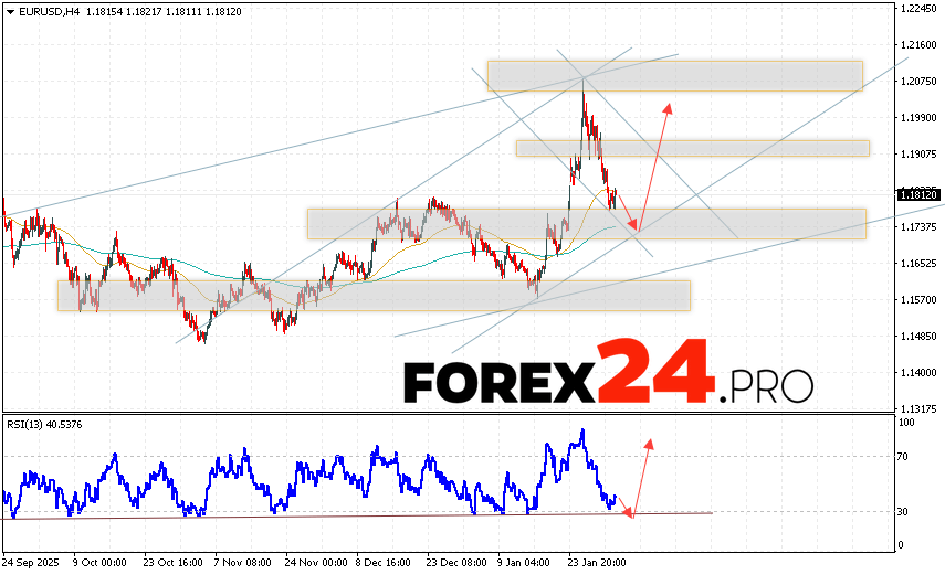 EUR/USD Forecast Euro Dollar for February 4, 2026 suggests an attempt at a bearish correction in currency quotes, testing support near 1.1745. This is where we should expect an upward rebound in the EUR/USD pair and an attempt at continued growth in the Forex market, targeting 1.2015. A rebound from the support line on the relative strength indicator (RSI) would serve as an additional signal. A decline in quotes and a breakout of 1.1655 would cancel out the EUR/USD upside. This will indicate a breakout of the support zone and a continued decline in the Forex currency pair toward 1.1475.