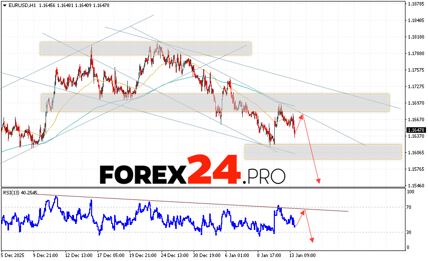 EUR/USD Forecast Euro Dollar for January 14, 2026suggests an attempt to rally, testing resistance near 1.1685. This is where we should expect a downward rebound in the EUR/USD pair and a continued decline in the Forex market, targeting 1.1545. A rebound from the resistance line on the relative strength indicator (RSI) would serve as an additional signal. A strong rally and a breakout of 1.1725 would cancel out the EUR/USD downside. This will indicate a breakout of the resistance zone and continued growth of the currency pair on Forex towards 1.1985.