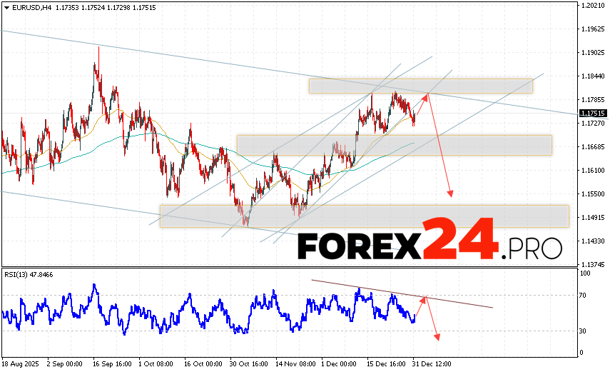 EUR/USD Forecast Euro Dollar for January 2, 2026 suggests an attempt at a bullish correction in currency quotes, testing resistance near 1.1785. This is where we should expect a downward rebound in the EUR/USD pair and an attempt at continued decline in the Forex market, targeting 1.1565. A breakout from the resistance line on the relative strength indicator (RSI) will serve as an additional signal. A strong rally and a breakout of 1.1875 would cancel the EUR/USD downside scenario. This would indicate a breakout of the resistance zone and continued growth in the Forex currency pair toward 1.1975.