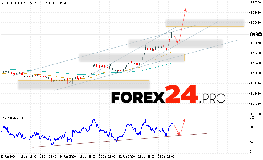 EUR/USD Forecast Euro Dollar for January 28, 2026 suggests an attempt at a correction in currency quotes with a test of the support level near 1.1905. We should expect an upward rebound in the Euro/Dollar currency pair and an attempt to continue the instrument’s growth on the Forex market, targeting 1.2145. A breakout from the support line on the relative strength indicator (RSI) would serve as an additional signal. A decline in the EUR/USD pair and a breakout of 1.1845 would cancel the upward trend. This would indicate a breakout of the support zone and a continued decline in the currency pair on Forex toward 1.1625.