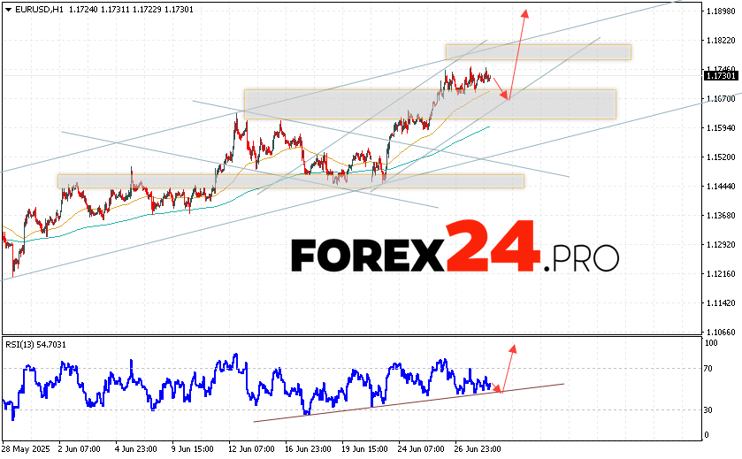 EUR/USD Forecast Euro Dollar for July 1, 2025suggests an attempt at a bearish correction of currency quotes with a test of the support level near 1.1675. From there, we can expect a rebound in the Euro-Dollar currency pair and an attempt to continue the rise in the asset’s value on the market to 1.1895. An auxiliary signal in favor of the instrument’s rise on the Forex market will be a rebound from the support line on the relative strength index (RSI). A decline in quotes and a breakout of the 1.1595 level will cancel the EUR/USD growth scenario. This will indicate a breakout of the support zone and a continuation of the currency pair’s decline on the Forex market to the 1.1365 mark.