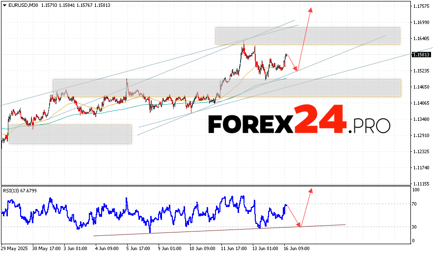 EURUSD Forecast Euro Dollar for June 17, 2025 suggests an attempt to develop an upward trend in currency quotes with a test of the support level near 1.1525. From there, we can expect to see a rebound in the Euro Dollar currency pair and an attempt to continue the growth of the asset’s value on the market to the 1.1755 mark. An auxiliary signal in favor of the instrument’s rise on the Forex market will be a rebound from the support line on the relative strength index (RSI). A decline in quotes and a breakout of the 1.1445 level will cancel the EUR/USD growth scenario. This will indicate a breakout of the support zone and a continuation of the currency pair’s decline on Forex to the 1.1305 mark.