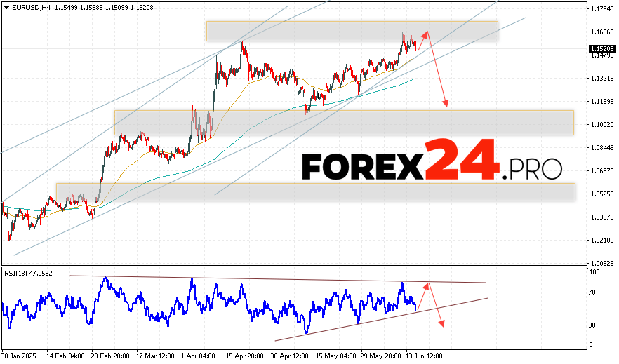 EUR/USD Forecast Euro Dollar for June 18, 2025 suggests an attempt to develop an upward trend in currency quotes with a test of the resistance level near 1.1625. From there, we should see a rebound in the Euro Dollar currency pair and an attempt to continue the decline in the asset’s value on the market to the 1.1165 mark. An auxiliary signal in favor of a decline in the instrument on the Forex market will be a rebound from the resistance line on the relative strength index (RSI). A strong rise in quotes and a breakout of the 1.1765 level will cancel the EUR/USD decline scenario. This will indicate a breakout of the resistance zone and a continuation of the currency pair’s rise on Forex to the 1.1975 mark.