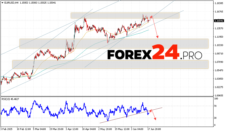 EUR/USD Forecast Euro Dollar for June 19, 2025 suggests an attempt to develop an upward movement in currency quotes with a test of the resistance level near 1.1555. From there, we should expect a rebound in the Euro-Dollar currency pair and an attempt to continue the decline in the asset’s value on the market to the 1.1205 mark. An auxiliary signal in favor of a decline in the instrument on the Forex market will be a rebound from the resistance line on the relative strength index (RSI). A strong rise in quotes and a breakout of the 1.1715 level will cancel the EUR/USD decline scenario. This will indicate a breakout of the resistance zone and a continuation of the currency pair’s rise on Forex to the 1.1895 mark.