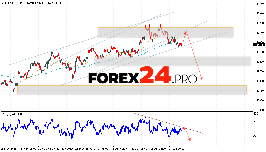 EUR/USD Forecast Euro Dollar for June 20, 2025 suggests an attempt to develop an upward movement in currency quotes with a test of the resistance level near 1.1555. From there, we should expect a rebound in the Euro-Dollar currency pair and an attempt to continue the decline in the asset’s value on the market to the 1.1225 mark. An auxiliary signal in favor of a decline in the instrument on the Forex market will be a rebound from the resistance line on the relative strength index (RSI). A strong rise in quotes and a breakout of the 1.1705 level will cancel the EUR/USD decline scenario. This will indicate a breakout of the resistance zone and a continuation of the currency pair’s rise on Forex to the 1.1875 mark.
