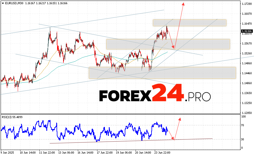 EUR/USD Forecast Euro Dollar for June 25, 2025 suggests an attempt at a bearish correction of currency quotes with a test of the support level near 1.1545. From there, we can expect to see a rebound in the Euro-Dollar currency pair and an attempt to continue the growth of the asset’s value on the market to the 1.1735 mark. An auxiliary signal in favor of the instrument’s rise on the Forex market will be a rebound from the support line on the relative strength index (RSI). A decline in quotes and a breakout of the 1.1475 level will cancel the EUR/USD growth scenario. This will indicate a breakout of the support zone and a continuation of the currency pair’s decline on Forex to the 1.1215 mark.