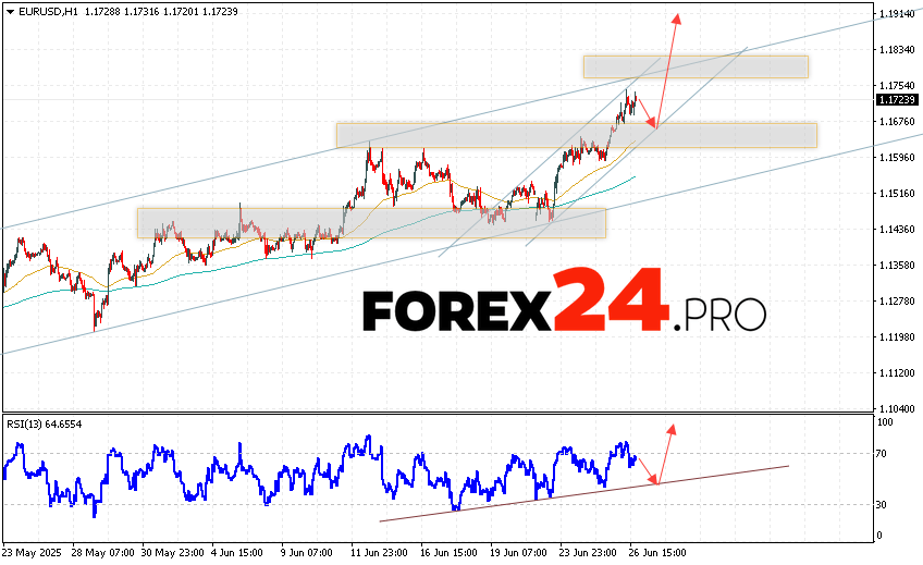 EUR/USD Forecast Euro Dollar for June 27, 2025 suggests an attempt at a bearish correction of currency quotes with a test of the support level near 1.1675. From there, we can expect a rebound in the Euro Dollar currency pair and an attempt to continue the rise in the asset’s value on the market to 1.1925. An auxiliary signal in favor of the instrument’s rise on the Forex market will be a rebound from the support line on the relative strength index (RSI). A decline in quotes and a breakout of the 1.1585 level will cancel the EUR/USD growth scenario. This will indicate a breakout of the support zone and a continuation of the currency pair’s decline on the Forex market to the 1.1375 mark.