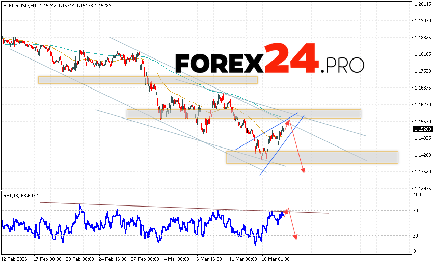 EUR/USD Forecast Euro Dollar for March 18, 2026 suggests an attempt to develop a bullish correction in currency quotes with a test of the resistance level near 1.1545. Where should we expect a downward rebound in the Euro/Dollar currency pair and an attempt to continue the instrument’s decline on the Forex market, targeting 1.1365? An additional signal supporting this scenario would be a rebound from the resistance line on the relative strength indicator (RSI). A strong rise in the EUR/USD pair and a breakout of 1.1635 would cancel the downward scenario. This would indicate a breakout of the resistance zone and continued growth of the currency pair on Forex towards 1.1805.