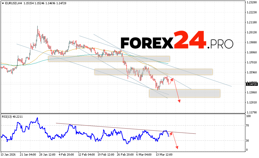 EUR/USD Forecast Euro Dollar for March 19, 2026 suggests an attempt at a bullish correction in currency quotes with a test of the resistance level near 1.1505. Where should we expect a downward rebound in the Euro/Dollar currency pair and an attempt to continue the instrument’s decline on the Forex market, targeting 1.1285? An additional signal supporting this scenario would be a rebound from the resistance line on the relative strength indicator (RSI). A strong rise in the EUR/USD pair and a breakout of 1.1635 would cancel the downward scenario. This would indicate a breakout of the resistance zone and continued growth of the currency pair on Forex towards 1.1785.