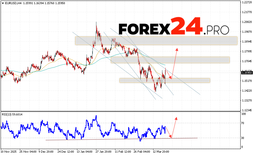 EUR/USD Forecast Euro Dollar for March 24, 2026 suggests an attempt to develop a bearish correction in currency quotes with a test of the support level near 1.1525. Where should we expect an upward rebound in the Euro/Dollar currency pair and an attempt to continue the instrument’s growth on the Forex market, targeting 1.1795? An additional signal supporting this scenario would be a breakout from the support line on the relative strength indicator (RSI). A decline in the EUR/USD pair and a breakout of 1.1435 would cancel the upward trend. This would indicate a breakout of the support zone and a continued decline in the currency pair on Forex toward 1.1285.
