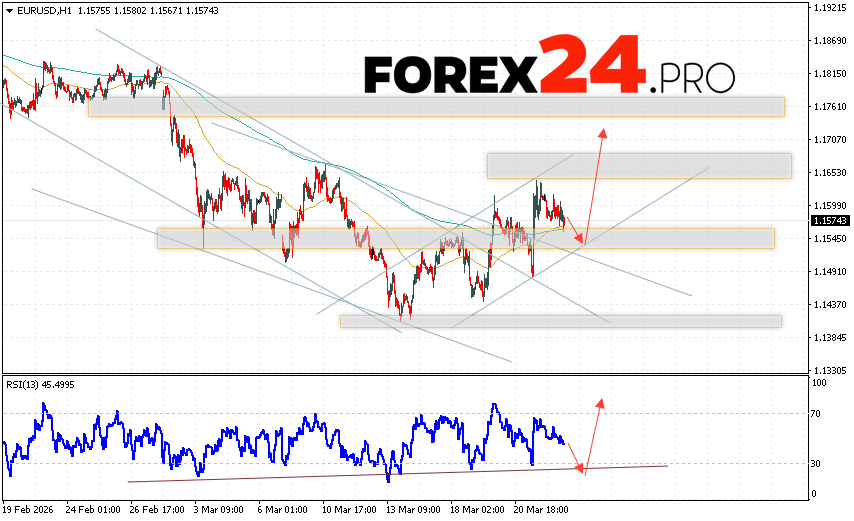 EUR/USD Forecast Euro Dollar for March 25, 2026 suggests an attempt at a bearish correction in currency quotes with a test of the support level near 1.1535. Where should we expect an upward rebound in the Euro/Dollar currency pair and an attempt to continue the instrument’s growth on the Forex market, targeting 1.1715? An additional signal supporting this scenario would be a breakout from the support line on the relative strength indicator (RSI). A decline in the EUR/USD pair and a breakout of 1.1485 would cancel the upward trend. This would indicate a breakout of the support zone and a continued decline in the currency pair on Forex toward 1.1315.