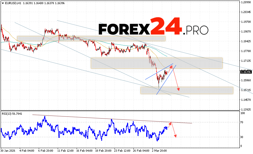 EUR/USD Forecast Euro Dollar for March 5, 2026 suggests an attempt at a bullish correction in currency quotes, testing resistance near 1.1660. This is where we should expect a downward rebound in the EUR/USD pair and an attempt at a continued decline in the instrument on the Forex market, targeting 1.1525. An additional signal supporting this scenario would be a breakout from the resistance line on the relative strength indicator (RSI). A strong rally and a breakout of 1.1765 would cancel out the EUR/USD downside scenario. This would indicate a breakout of the resistance zone and a continued rise in the currency pair on Forex to 1.1925.