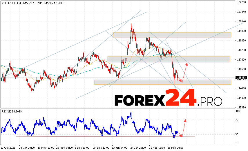 EUR/USD Forecast Euro Dollar for March 6, 2026 suggests an attempt at a bearish correction in currency quotes, testing support near 1.1560. This is where we should expect an upward rebound in the EUR/USD pair and an attempt at continued growth in the Forex market, targeting 1.1725. An additional signal supporting this scenario would be a break from the support line on the relative strength indicator (RSI). A decline in the EUR/USD pair and a break of 1.1475 would cancel the upward trend. This would indicate a break of the support zone and a continued decline in the currency pair on Forex toward 1.1275.
