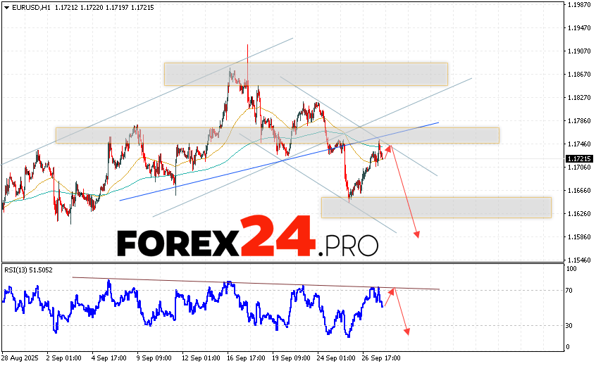 EUR/USD Forecast Euro Dollar for October 1, 2025 suggests an attempt at a bullish correction in currency quotes, testing resistance near 1.1735. This is where we should expect a downward rebound in the EUR/USD pair and an attempt at a continued decline in the asset’s value to 1.1585. A rebound from the resistance line on the relative strength indicator (RSI) will serve as an additional signal favoring a decline in the instrument on the Forex market. A strong rally and a breakout of 1.1795 would cancel the EUR/USD downside scenario. This would indicate a breakout of the resistance zone and a continued rise in the currency pair on Forex to 1.1985.
