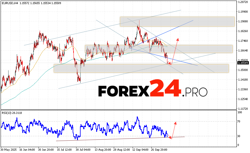 EUR/USD Forecast Euro Dollar for October 10, 2025 suggests an attempt at a bearish correction in currency quotes, testing support near 1.1535. This is where we should expect an upward rebound in the EUR/USD pair and an attempt at continued growth to 1.1745. A rebound from the support line on the relative strength indicator (RSI) will serve as an additional signal in favor of an uptrend in the Forex market. A decline in quotes and a breakout of 1.1505 will cancel out the EUR/USD uptrend. This will indicate a breakout of the support zone and a continued decline in the currency pair on Forex toward 1.1325.