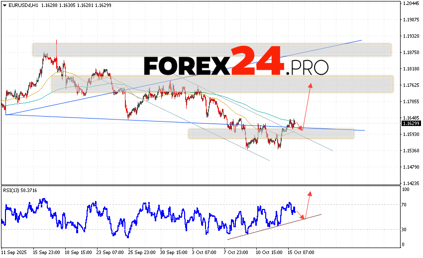 EUR/USD Forecast Euro Dollar for October 16, 2025 suggests an attempt at a bearish correction in currency quotes, testing support near 1.1605. This is where we should expect an upward rebound in the EUR/USD pair and an attempt at continued growth to 1.1765. A rebound from the support line on the relative strength indicator (RSI) will serve as an additional signal in favor of an uptrend in the Forex market. A decline in quotes and a breakout of 1.1515 will cancel out the EUR/USD uptrend. This will indicate a breakout of the support zone and a continued decline in the currency pair on Forex toward 1.1375.