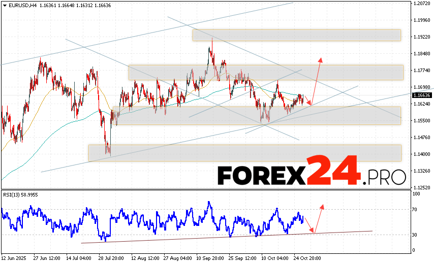 EUR/USD Forecast Euro Dollar for October 30, 2025 suggests an attempt at a bearish correction in currency quotes, testing support near 1.1625. This is where we should expect an upward rebound in the EUR/USD pair and an attempt at continued growth to 1.1845. A rebound from the support line on the relative strength indicator (RSI) will serve as a supporting signal for an upside move in the Forex market. A decline in quotes and a breakout of 1.1545 will cancel out the EUR/USD rally. This will indicate a breakout of the support zone and a continued decline in the Forex currency pair toward 1.1395.