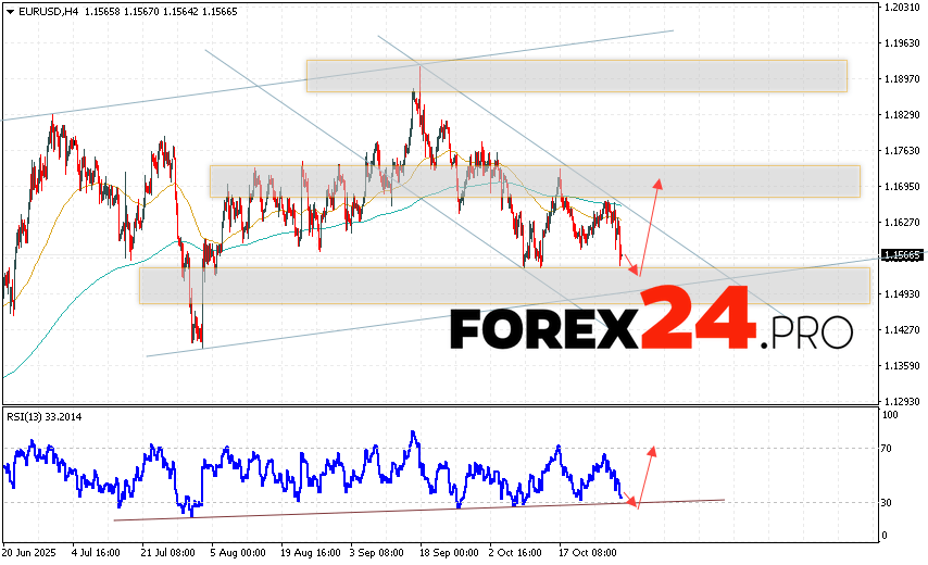 EUR/USD Forecast Euro Dollar for October 31, 2025 suggests an attempt at a bearish correction in currency quotes, testing support near 1.1535. This is where we should expect an upward rebound in the EUR/USD pair and an attempt at continued growth to 1.1685. A rebound from the support line on the relative strength indicator (RSI) would be a further signal in favor of an uptrend in the Forex market. A decline in quotes and a breakout of 1.1475 would cancel out the EUR/USD upside. This will indicate a breakout of the support zone and a continued decline in the Forex currency pair toward 1.1325.