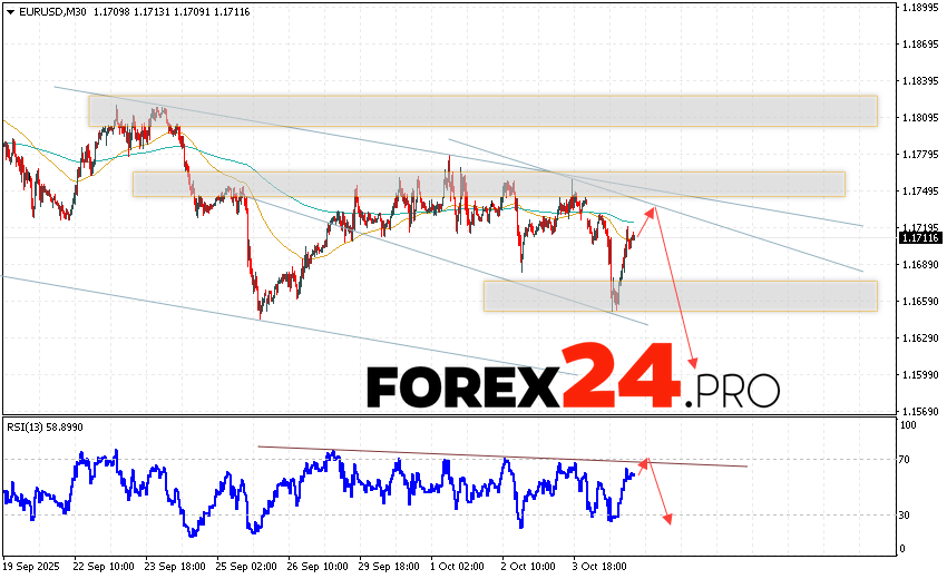 EUR/USD Forecast Euro Dollar for October 7, 2025 suggests an attempt at a bullish correction in currency quotes, testing resistance near 1.1735. This is where we should expect a downward rebound in the EUR/USD pair and an attempt at a continued decline in the asset’s value to 1.1585. A rebound from the resistance line on the relative strength indicator (RSI) will serve as an additional signal favoring a decline in the Forex instrument. A strong rally and a breakout of 1.1775 would cancel out the EUR/USD downside scenario. This would indicate a breakout of the resistance zone and a continued rise in the currency pair on Forex to 1.1985.