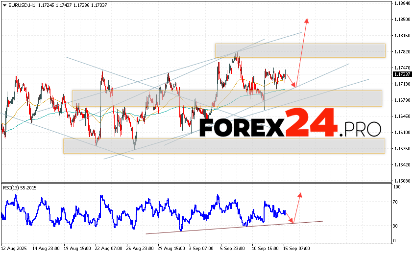 EUR/USD Forecast Euro Dollar for September 17, 2025 suggests an attempt to develop a bearish correction of currency quotes with a test of the support level near the level of 1.1705. Where should we expect a rebound in quotes upwards for the Euro Dollar currency pair and an attempt to continue the growth of the asset value on the market to the level of 1.1875. An additional signal in favor of raising the instrument on the Forex market will be a rebound from the support line on the relative strength indicator (RSI). The cancellation of the growth option for the EUR/USD pair will be a drop in quotes and a breakout of the level of 1.1635. This will indicate a breakout of the support zone and a continuation of the decline of the currency pair on Forex to the level of 1.1465.