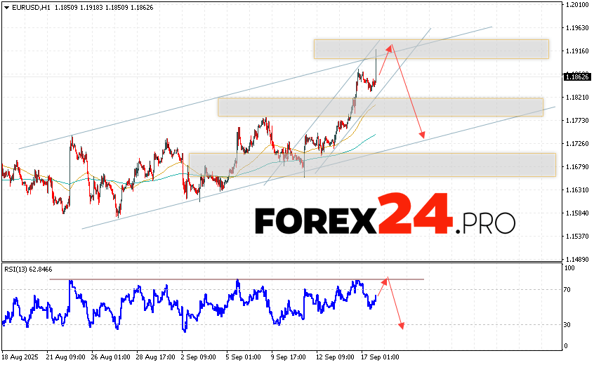 EUR/USD Forecast Euro Dollar for September 18, 2025 suggests an attempt at a bullish correction in the currency pair, testing resistance near 1.1915. From here, we should expect a downward rebound in the EUR/USD pair and an attempt at a continued decline to 1.1745. A rebound from the resistance line on the relative strength indicator (RSI) will serve as a supporting signal for a decline in the Forex instrument. A strong rally and a breakout of 1.1965 will cancel out the EUR/USD downside scenario. This will indicate a breakout of the resistance zone and a continued rise in the Forex currency pair to 1.2125.