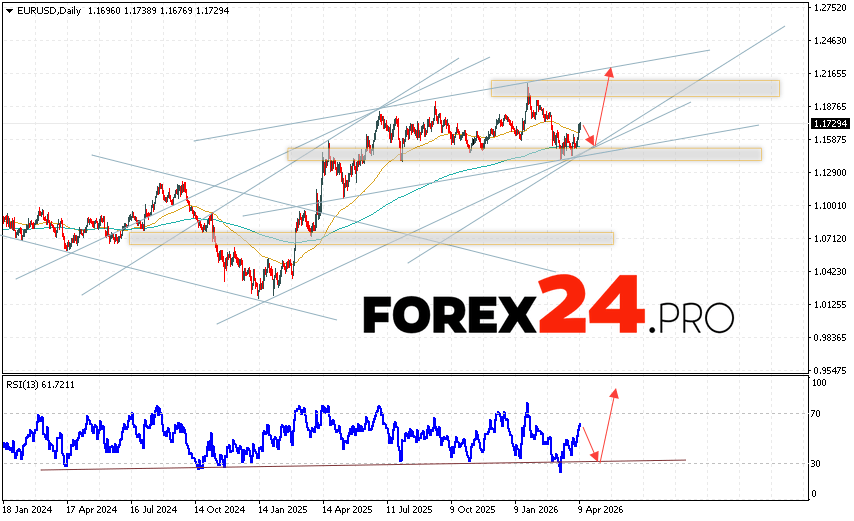 EUR/USD Weekly Forecast April 13 – 17, 2026 suggests an attempt at a bearish correction and a test of the support area near 1.1575. From this point, we should expect an upward price rebound and continued growth in the Forex market above 1.2165. An additional signal in favor of an upside move would be a test of the support line on the relative strength indicator (RSI). A decline and a break of 1.1255 would cancel out the EUR/USD rally. In this case, we should expect continued decline with a potential target at 1.0965.