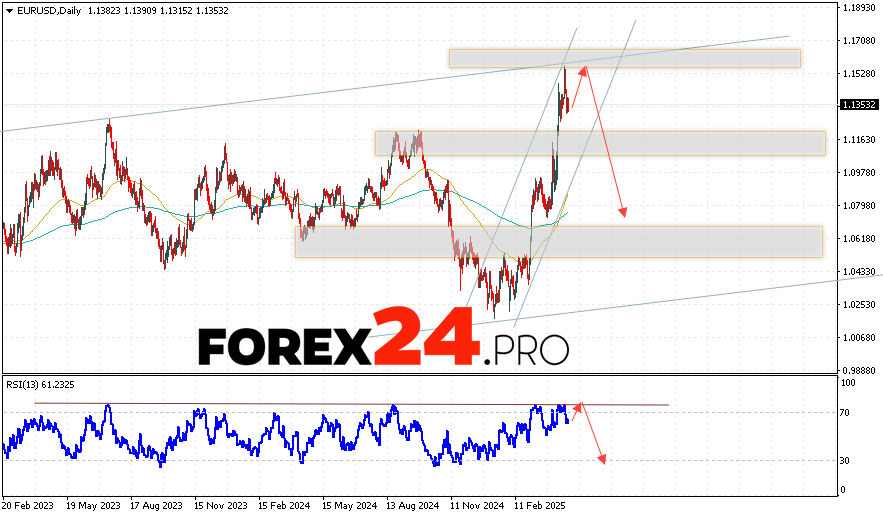 EUR/USD Weekly Forecast April 28, 2025 — May 2, 2025 suggests an attempt to develop a bullish correction and test the resistance area near the level of 1.1525. Where should we expect a downward price rebound and a continuation of the pair’s fall on the Forex market to the area below the level of 1.0795. An additional signal in favor of a decline will be a test of the resistance line on the relative strength indicator (RSI). The cancellation of the Euro Dollar fall scenario will be a strong growth and a breakout of the 1.1765 level. In this case, we should expect the pair to continue to rise with a potential target at the level of 1.1995.
