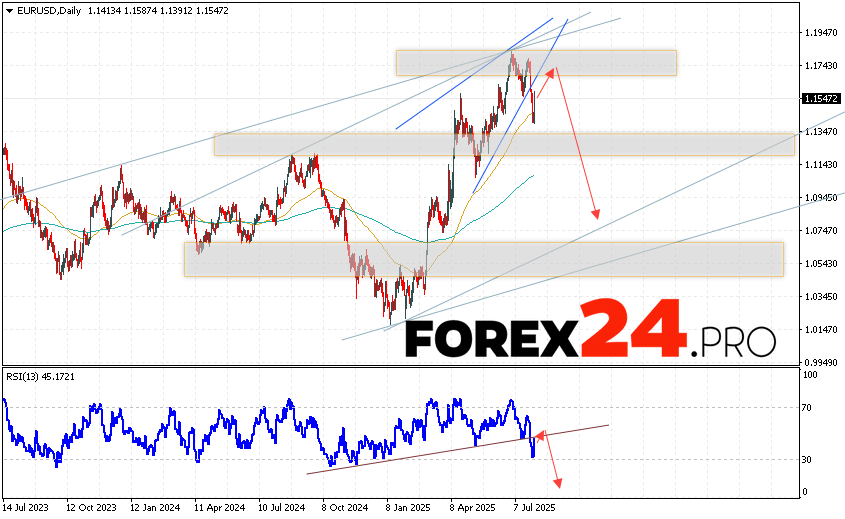 EUR/USD Weekly Forecast August 4 — 8, 2025 suggests an attempt at a bullish correction and a test of the resistance area near the 1.1715 level. From there, we can expect a downward price rebound and a continuation of the pair’s decline in the Forex market to an area below the 1.0835 level. An additional signal in favor of a decline will be a test of the resistance line on the relative strength index (RSI). A strong rise and a breakout of the 1.2055 level will cancel the Euro Dollar decline scenario. In this case, we can expect the pair to continue rising with a potential target of 1.2365.