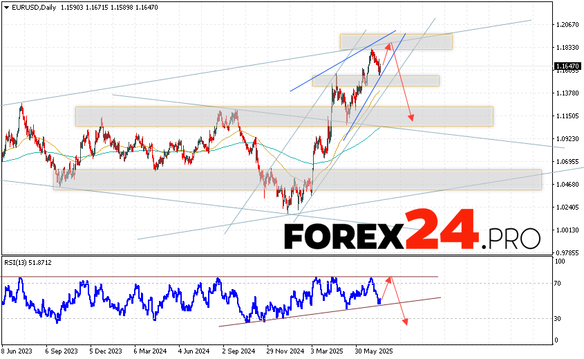 EUR/USD Weekly Forecast July 21 — 25, 2025 suggests an attempt at a bullish correction and a test of the resistance area near the 1.1835 level. From there, we can expect a downward price rebound and a continuation of the pair’s decline in the Forex market to an area below the 1.1145 level. An additional signal in favor of a decline will be a test of the resistance line on the relative strength index (RSI). A strong rise and a breakout of the 1.2065 level will cancel the Euro Dollar decline scenario. In this case, we should expect the pair to continue rising with a potential target at 1.2345.