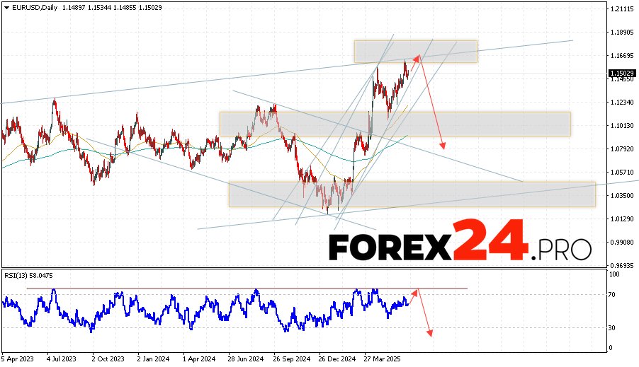 EUR/USD Weekly Forecast June 23 — 27, 2025 suggests an attempt to develop an upward trend in currency quotes with a test of the resistance level near 1.1665. From there, we should see a rebound in the Euro Dollar currency pair and an attempt to continue the decline in the asset’s value on the market to the 1.0845 mark. An auxiliary signal in favor of a decline in the instrument on the FOREX market will be a rebound from the resistance line on the relative strength index (RSI). A strong rise in quotes and a breakout of the 1.1725 level will cancel the EUR/USD decline scenario. This will indicate a breakout of the resistance zone and a continuation of the currency pair’s rise on Forex to the 1.1905 mark.