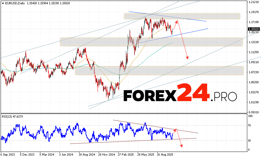 EUR/USD Weekly Forecast November 10 – 14, 2025 suggests an attempt at a bullish correction and a test of the resistance area near 1.1725. From this point, a downward price rebound and a continued decline in the pair on the Forex market below 1.0965 should be expected. An additional signal supporting a decline would be a test of the resistance line on the relative strength indicator (RSI). A strong rally and a breakout of 1.2065 would cancel out the EUR/USD decline. In this case, we should expect continued upside with a potential target at 1.2345.