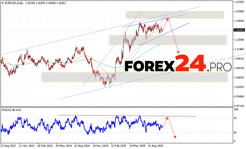 EUR/USD Weekly Forecast October 27 – 31, 2025 suggests an attempt at a bullish correction and a test of the resistance area near 1.1865. From there, a downward rebound and a continued decline in the pair on the Forex market below 1.1125 should be expected. A test of the resistance line on the relative strength indicator (RSI) would be an additional signal of decline. A strong rally and a breakout of 1.2075 would cancel the EUR/USD decline scenario. In this case, we should expect continued upward movement of the pair, with a potential target at 1.2465.