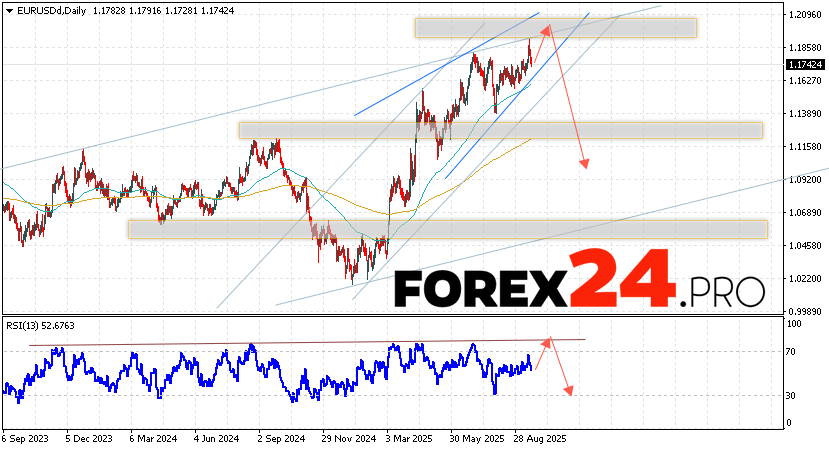 EUR/USD Weekly Forecast September 22 – 26, 2025 suggests an attempt at a bullish correction and a test of the resistance area near 1.1875. From there, a downward rebound and continued decline in the pair on the Forex market below 1.0965 should be expected. An additional signal supporting a decline would be a test of the resistance line on the relative strength indicator (RSI). A strong rally and a breakout of 1.2145 would cancel out the EUR/USD decline. In this case, a continued rise in the pair is expected, with a potential target at 1.2425.