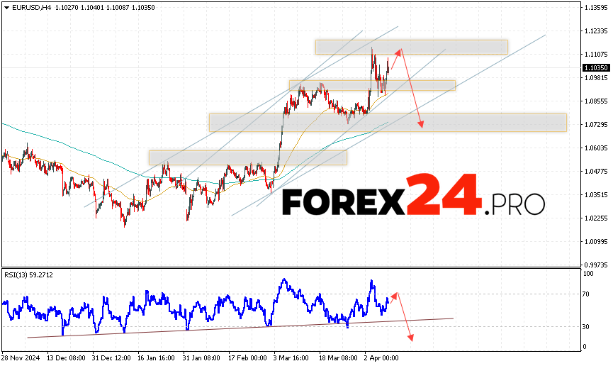 EUR/USD Forecast Euro Dollar for April 10, 2025 suggests an attempt to develop the pair’s growth and a test of the resistance area near the level of 1.1105. From where one should consider a rebound in the price of the Euro Dollar currency pair downwards and an attempt to continue the asset’s fall on the market to the area below the level of 1.0735. An additional signal in favor of a decline in the instrument on the Forex market will be a test of the resistance line on the relative strength indicator (RSI). The cancellation of the EUR/USD fall option will be a strong increase in quotes and a breakout of the level of 1.1165. This will indicate a breakout of the resistance area and continued growth of the currency pair on Forex to the area above the level of 1.1315.