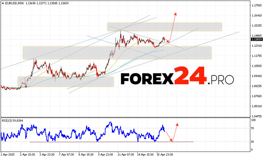 EUR/USD Forecast Euro Dollar for April 17, 2025 suggests an attempt to develop a bearish correction of the pair and a test of the support area near the level of 1.1325. From where it is worth considering an upward rebound in the price of the Euro Dollar currency pair and an attempt to continue the growth of the asset on the market to the area above the level of 1.1645. An additional signal in favor of the rise of the instrument on the Forex market will be a test of the support line on the relative strength indicator (RSI). The cancellation of the growth option for the EUR/USD pair will be a drop in quotes and a breakout of the level of 1.1255. This will indicate a breakout of the support area and a continuation of the fall of the currency pair on Forex to the area below the level of 1.1045.