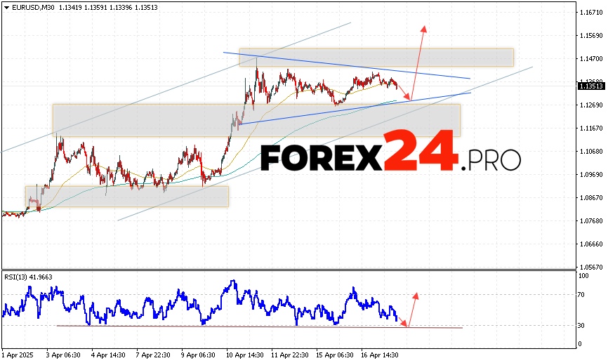EUR/USD Forecast Euro Dollar for April 18, 2025 suggests an attempt to develop a bearish correction of the pair and a test of the support area near the level of 1.1275. Where should we consider the upward rebound in the price of the Euro Dollar currency pair and an attempt to continue the growth of the asset on the market to the area above the level of 1.1575. An additional signal in favor of the instrument’s rise on the Forex market will be a test of the support line on the relative strength indicator (RSI). The cancellation of the growth option for the EUR/USD pair will be a drop in quotes and a breakout of the 1.1205 level. This will indicate a breakout of the support area and a continuation of the fall of the currency pair on Forex to the area below the 1.1035 level.