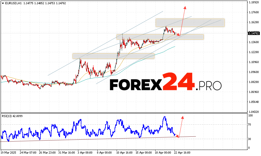 EUR/USD Forecast Euro Dollar for April 23, 2025 suggests an attempt to develop a bearish correction of the pair and a test of the support area near the level of 1.1435. Where should we consider an upward rebound in the price of the Euro Dollar currency pair and an attempt to continue the growth of the asset on the market to the area above the level of 1.1775. An additional signal in favor of the instrument’s rise on the Forex market will be a test of the support line on the relative strength indicator (RSI). The cancellation of the growth option for the EUR/USD pair will be a drop in quotes and a breakout of the 1.1345 level. This will indicate a breakout of the support area and a continuation of the fall of the currency pair on Forex to the area below the 1.1135 level.